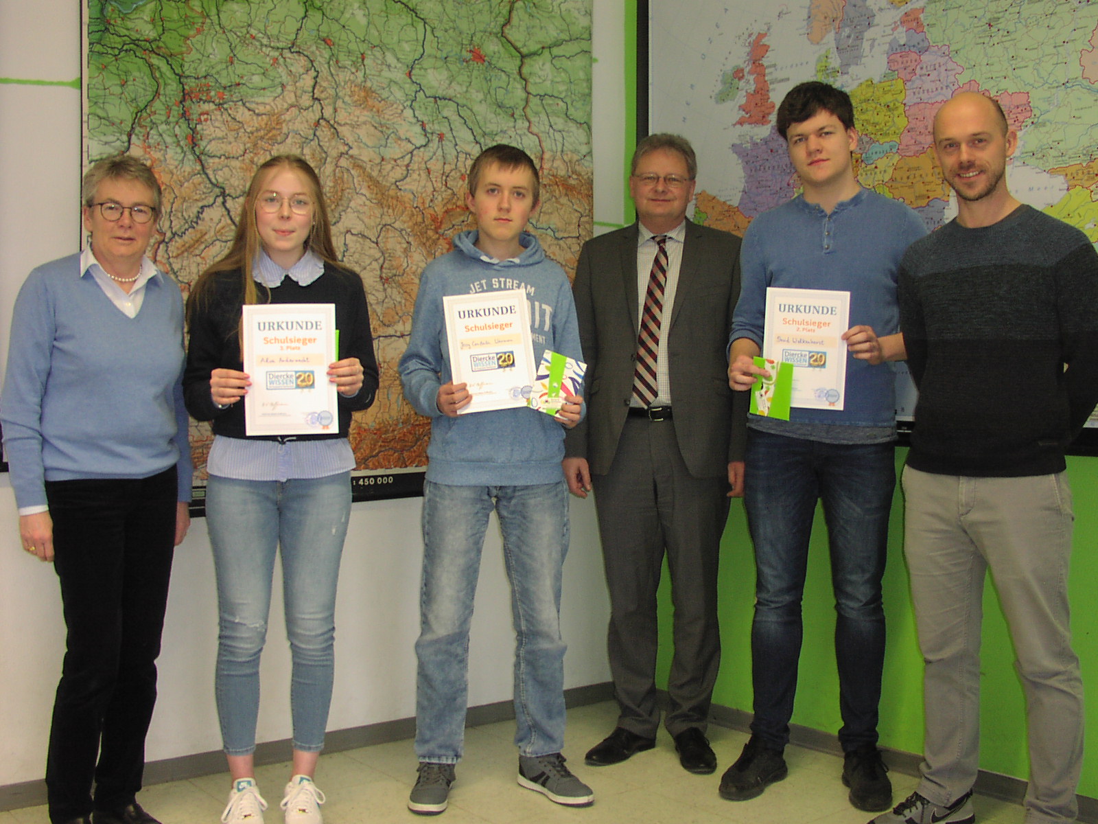 Bereits zum zweiten Mal konnte Josey Constantin Wörmann aus der Klasse 9d sein geographisches Wissen erfolgreich unter Beweis stellen: Beim diesjährigen Wettbewerb „Diercke Wissen“ holte er sich den ersten Platz, gefolgt von David Walkenhorst und Alva Andernacht, beide aus der Jahrgangsstufe 10. Alle drei erhielten eine Urkunde sowie einen Büchergutschein gesponsert vom Schulverein.