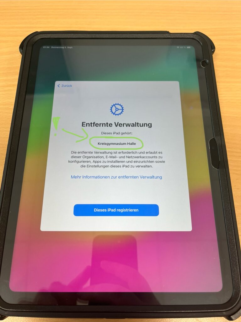 ACHTUNG: Sollte in dem unter 7. beschriebenen Konfigurationsschritt bei Ihnen nicht „Kreisgymnasium Halle“ sondern ein anderer Eintrag stehen, so hat sich ein Gerät in unseren Bestand geschlichen, das noch einer anderen Schule unseres Schulträgers zugeordnet ist. Halten Sie dann bitte Rücksprache mit Herrn Rothe oder Herrn Jaschke für einen zügigen Austausch des Geräts!